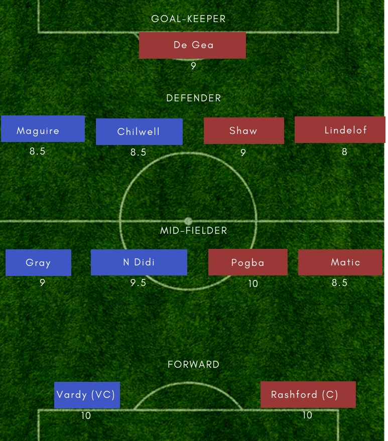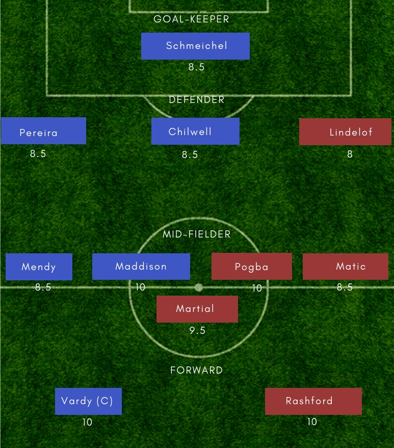 Leicester City– Schmeichel (GK), Pereira, Evans, Maguire, Chilwell, Mendy, Ndidi, Gray, Maddison, Albrighton, Vardy