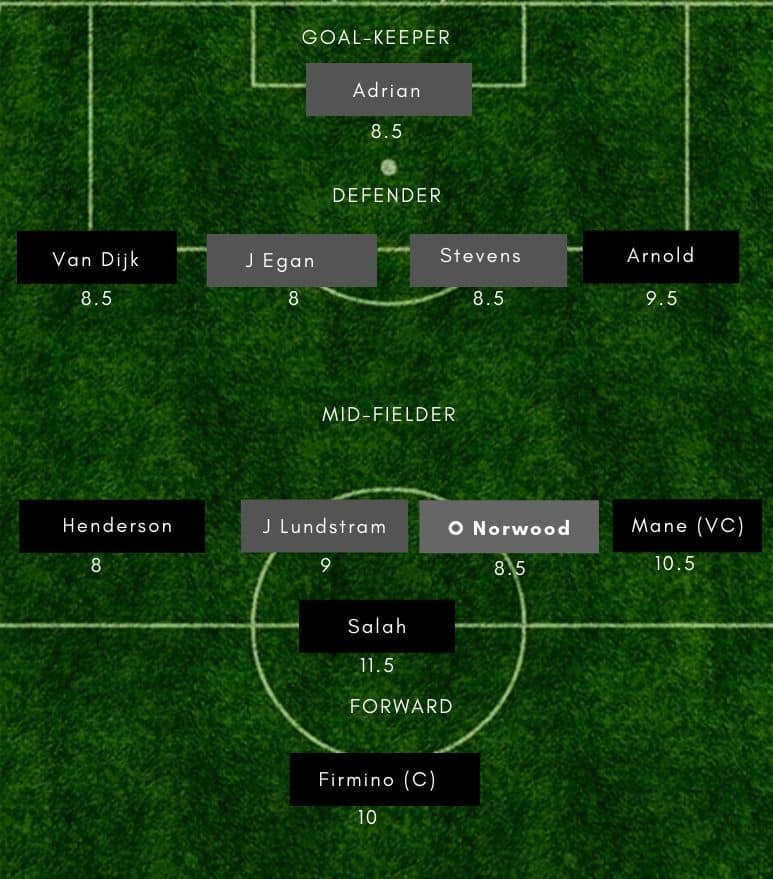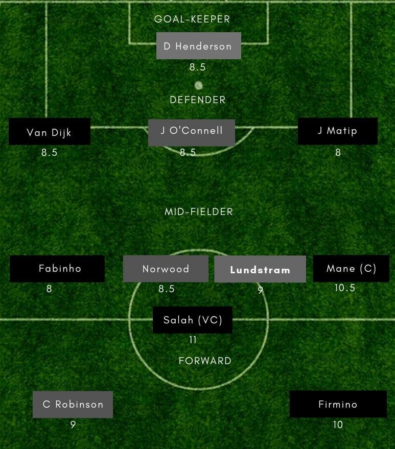 Adrian (GK), Robertson, Matip, Van Dijk, Trent-Alexander Arnold, Wijnaldum, Fabinho, Henderson, Mane, Firmino, Salah