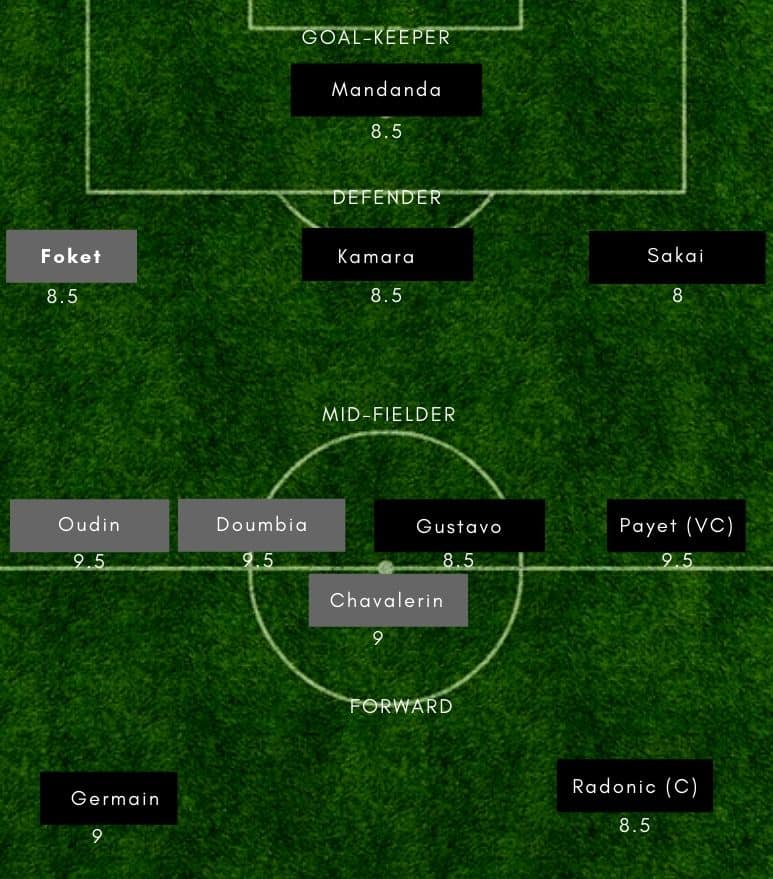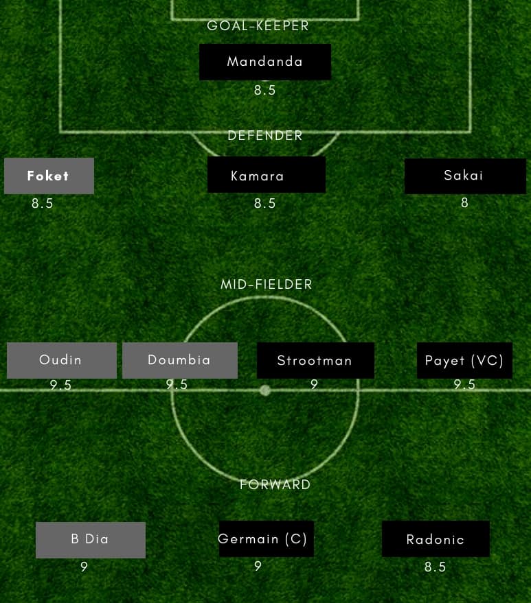 Steve Mandanda (GK), Jordan Amavi, Boubacar Kamara, Duje Caleta-Car, Hiroki Sakai, Morgan Sanson, Kevin Strootman, Luiz Gustavo, Dimitri Payet, Bouna Sarr / Florian Thauvin, Valere Germain