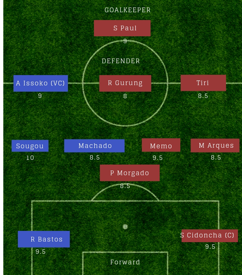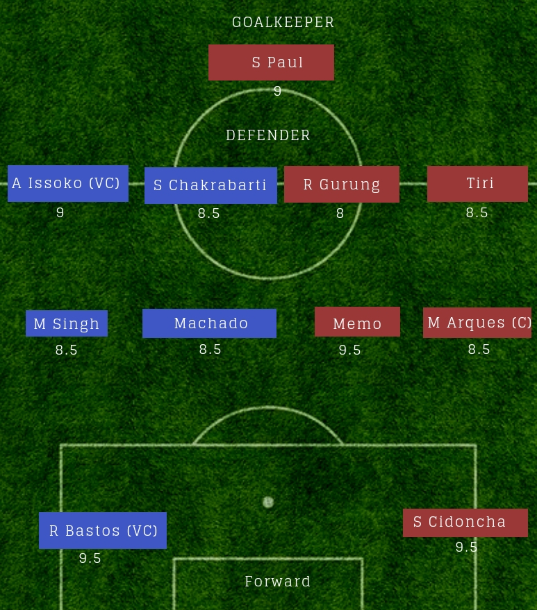 Mumbai City FC– Amrinder Singh (GK), Sauvik Chakrabarti, Lucian Goian, Anwar Ali, Subhasish Bose, Arnold Issoko, Raynier Fernandes, Milan Singh, Paulo Machado, Rafael Bastos, Matias Mirabaje