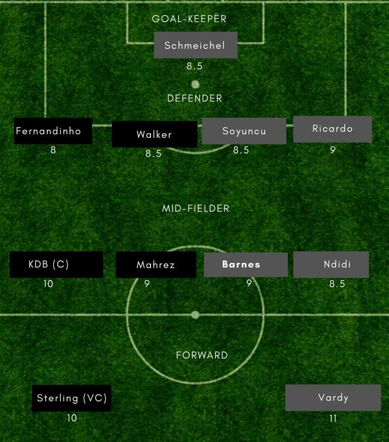 Leicester City: Kasper Schmeichel (GK), Ricardo Pereira, Soyuncu, Jonny Evans, Ben Chilwell, Ayoze Perez, Youri Tielemans, Wilfried Ndidi, James Maddison, Harrison Barnes, Jamie Vardy