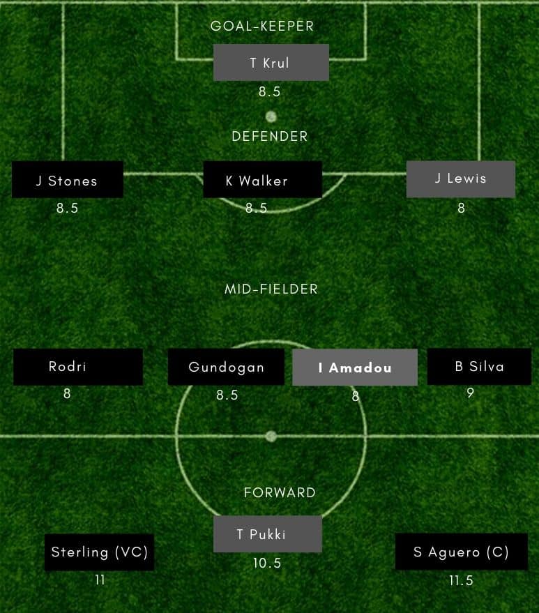 Ederson (GK), Zinchenko, John Stones, Otamendi, Kyle Walker, David Silva, Ilkay Gundogan, Kevin de Bruyne, Raheem Sterling, Bernardo Silva, Sergio Aguero