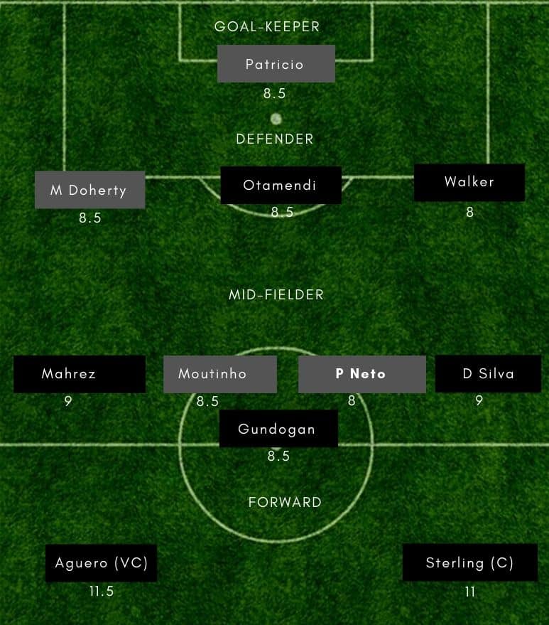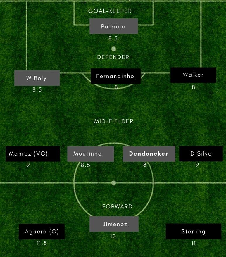 Ederson (GK), Walker, Fernandinho, Otamendi, Mendy, Gundogan, Rodri, David Silva, Mahrez, Sterling, Aguero