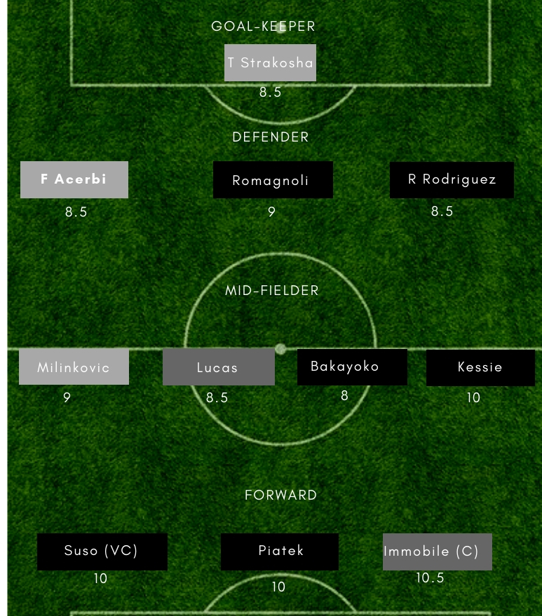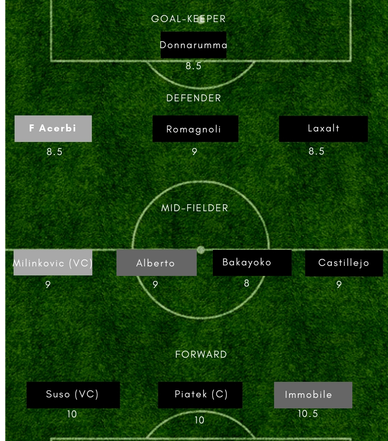 MIL vs LAZ Dream11 Playing 11 – (Probable) – Lazio – Strakosha (GK), Radu, Acerbi, Patric, Badelj, Cataldi, Milinkovic-Savic, Lulic, Marusic, Immobile, Caicedo AC Milan – Donnarumma (GK), Calabria, Musacchio, Romagnoli, Rodriguez; Bakayoko, Kessie, Paqueta; Suso, Calhanoglu, Piatek