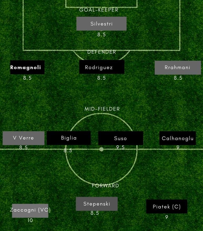 Donnarumma (GK), Calabria, Musacchio, Romagnoli, Rodriguez, Paqueta, Bennacer, Kessie, Calhanoglu, Suso, Piatek