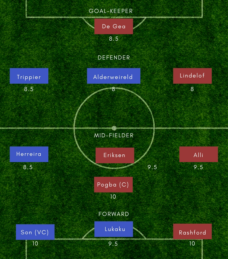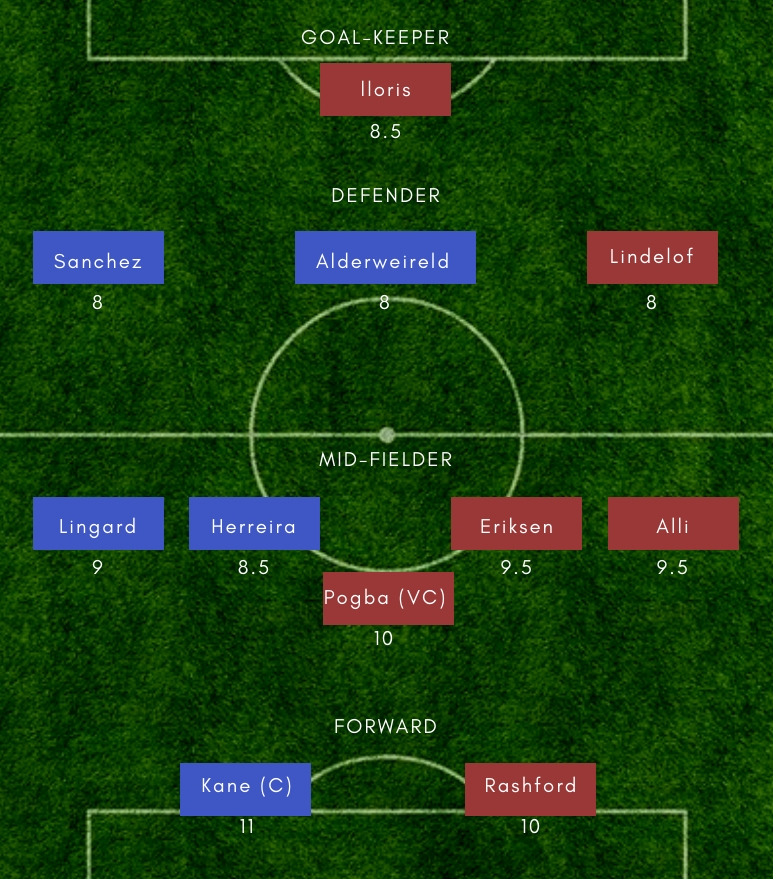 MUN vs TOT Dream11 Playing 11 – (Probable) – Tottenham Hotspur– Lloris (GK), Trippier, Sanchez, Alderweireld, Rose, Sissoko, Winks, Alli, Eriksen; Son, Kane Manchester United – De Gea (GK), Young, Lindelof, Jones, Shaw, Herrera, Matic; Lingard, Pogba, Martial; Rashford