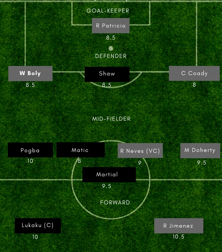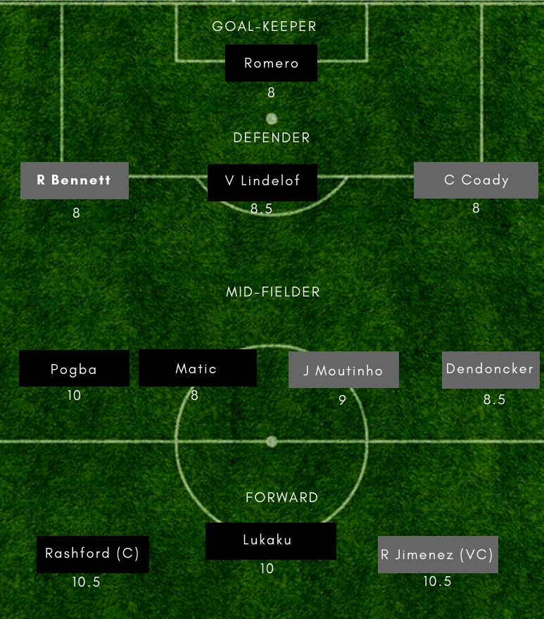 Wolverhampton Wanderers– Ruddy (GK), Saiss, Coady, Boly; Doherty, Dendoncker, Neves, Moutinho, Jonny; Jimenez, Jota Manchester United– Romero (GK), Young, Lindelof, Smalling, Rojo; McTominay, Pogba, Fred; Martial, Rashford, Lukaku