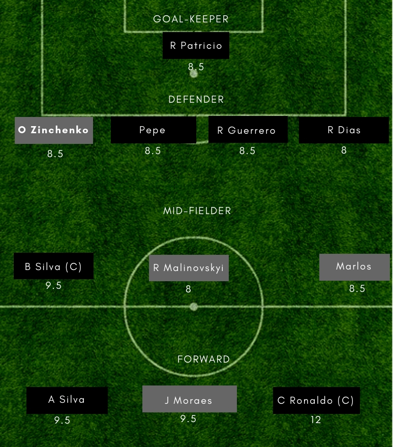 POR vs UKR Dream11 Playing 11 – (Probable) – Portugal– Patricio (GK), Rui, Dias, Pepe, Cancelo, Carvalho, Pizzi, Guerreiro, Bernardo Silva, Andre Silva, Cristiano Ronaldo Ukraine– Pyatov (GK), Karavaev, Burda, Krivtsov, Mykolenko, Zinchenko, Malinovskiy, Stepanenko, Marlos, Tsygankov, Moraes