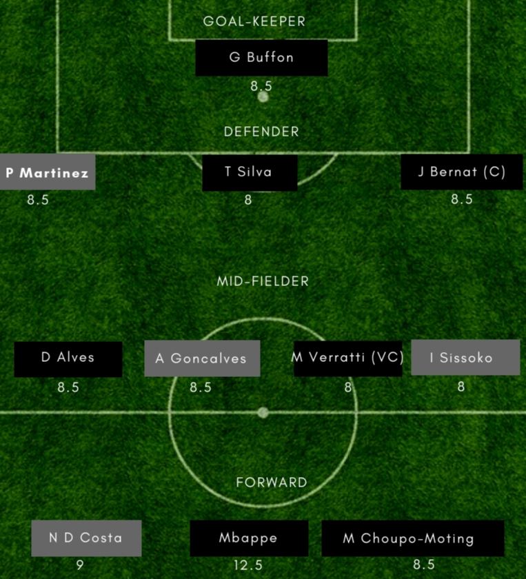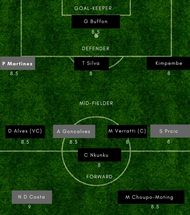 Paris Saint-Germain– Buffon (GK), Kurzawa, Kimpembe, Silva, Kehrer, Alves, Draxler, Paredes, Verratti, Choupo-Moting