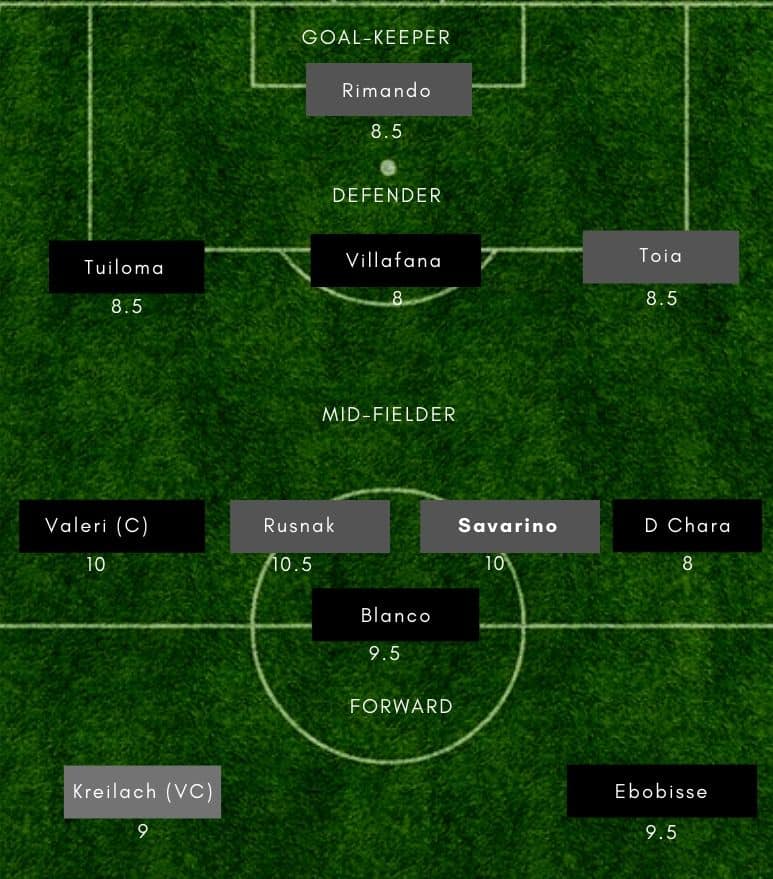 Calrk (GK), Villafana, Tuiloma, Mabiala, Moreira, Paredes, Chara, Blanco, Valeri, Asprilla, Ebobisse