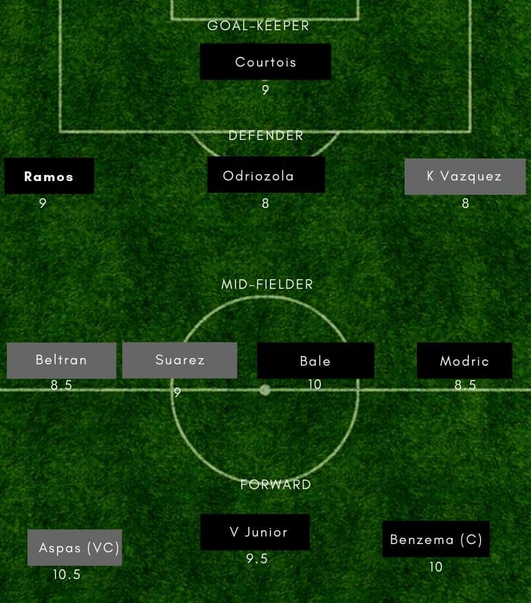 Benzema and Aspas should be taken, with midfield and defence equally distributed between the two teams, with Courtois as the goalkeeper.