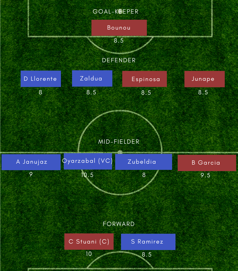 Rulli (GK), Zaldua, Navas, Llorente, Munoz, Merino, Zubeldia, Zurutuza, Janujaz, Ramirez, Oyarzabal