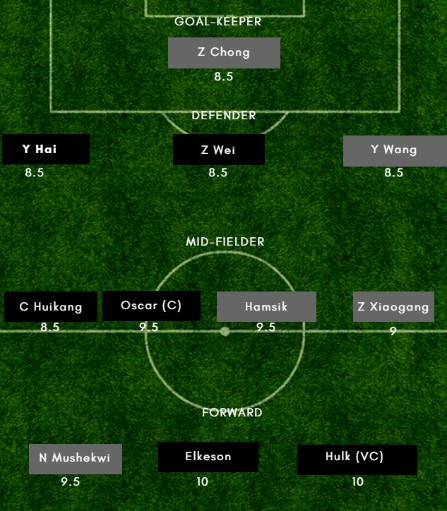 Goalkeeper: Z Chong Defenders: Y Wang, Z Wei, Y Hai Midfielders: M Hamsik, Z Xiaogang, C Huikang, Oscar (C) Forwards: Hulk (VC), Elkeson, N Muskekwi