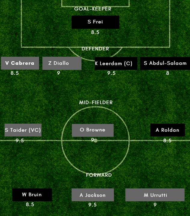 Goalkeeper: S Frei Defenders: Leerdam, Diallo, Cabrera, Abdul-Salaam Midfielders: Taider, Browne, A Roldan Forwards: Jackson-Hamel, Urrutti, Bruin