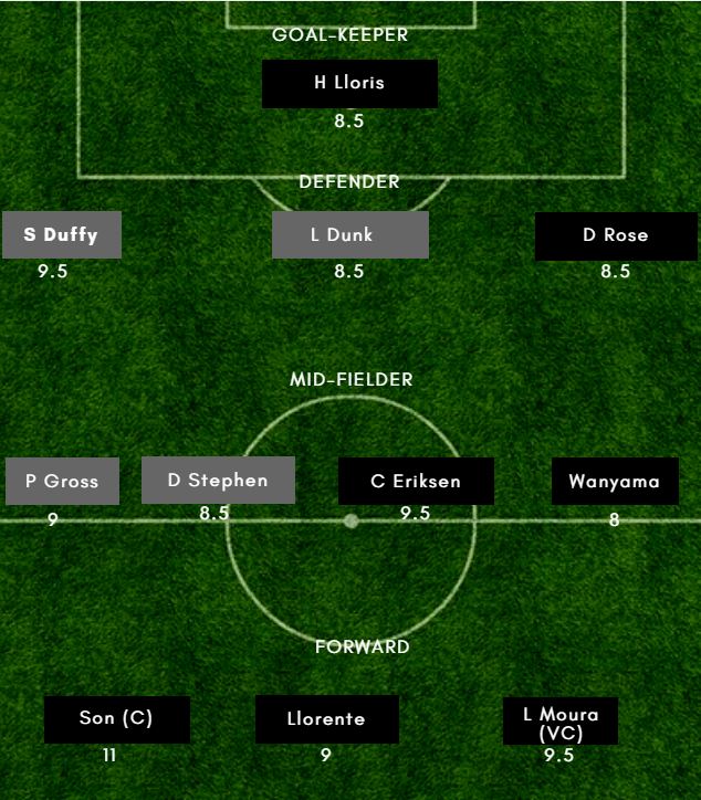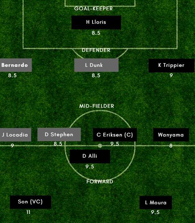 TOT vs BHA Dream11 Playing 11 – (Probable) – Tottenham Hotspur– Gazzaniga (GK), Trippier, Alderweireld, Vertonghen, Rose; Dier, Winks; Son, Alli, Eriksen; Moura Brighton & Hove Albion– Ryan (GK), Montoya, Duffy, Dunk, Bernardo; March, Kayal, Stephens, Locadia; Gross; Murray