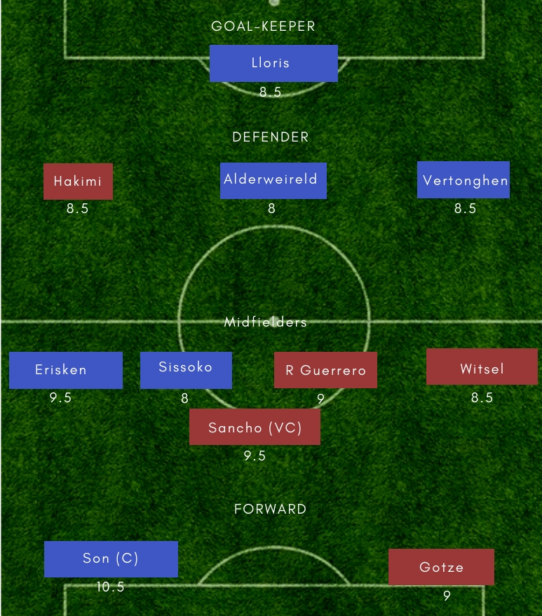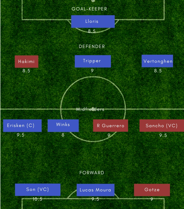 TOT vs DOR Dream11 Playing 11 – (Probable) – Tottenham Hotspur– Lloris (GK), Trippier, Sanchez, Alderweireld, Vertonghen, Sissoko, Dier, Lamena, Erikson, Son, Moura Borussia Dortmund– Bürki (GK), Hakimi, Toprak, Diallo, Schmelzer, Witsel, Delaney, Sancho, Pulisic, Guerreiro, Götze