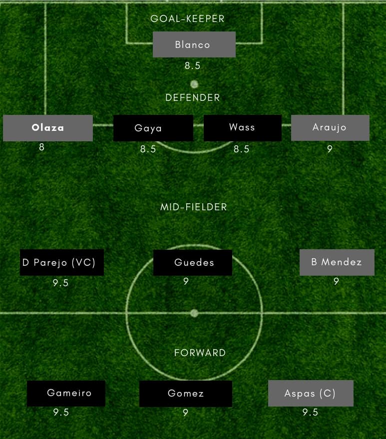 Blanco (GK), Olaza, Araujo, Costas, Mallo, Suarez, Beltran, Lobotka, Mendez, Aspas, Mina / Fernandez