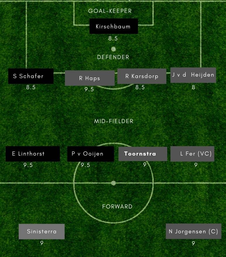 Feyenoord: Kenneth Vermeer (GK), Rick Karsdorp, Eric Botteghin, Marcos Senesi, Ridgeciano Haps, Renato Hapia, Leroy Fer, Steven Berghuis, Jens Toornstra, Luis Sinisterra, Nicolai Jorgensen