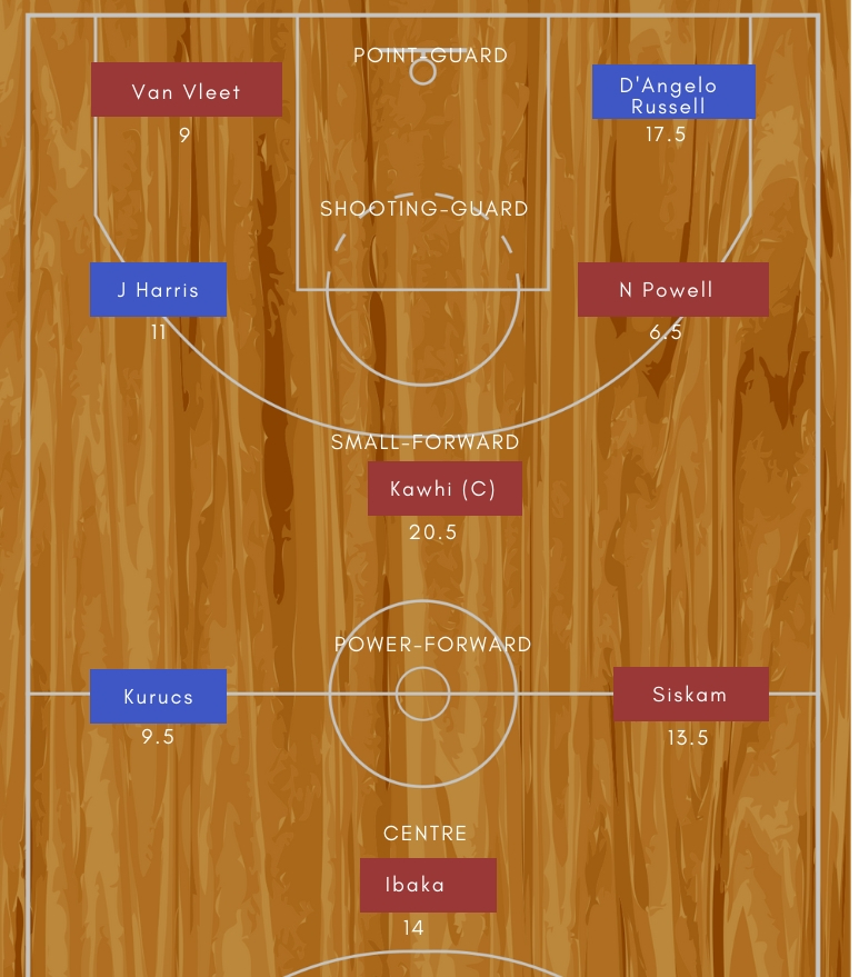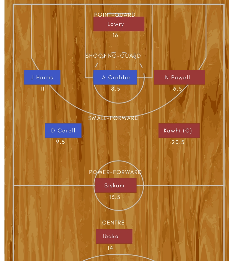 • Toronto Raptors: Kawhi Leonard (F), Pascal Siakam (F), Serge Ibaka (C), Kyle Lowry (G), Danny Green (G)