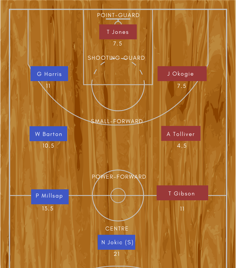 Denver Nuggets: Will Barton (F), Paul Millsap (F), Nikola Jokic (C), Jamal Murray (G), Gary Harris (G)