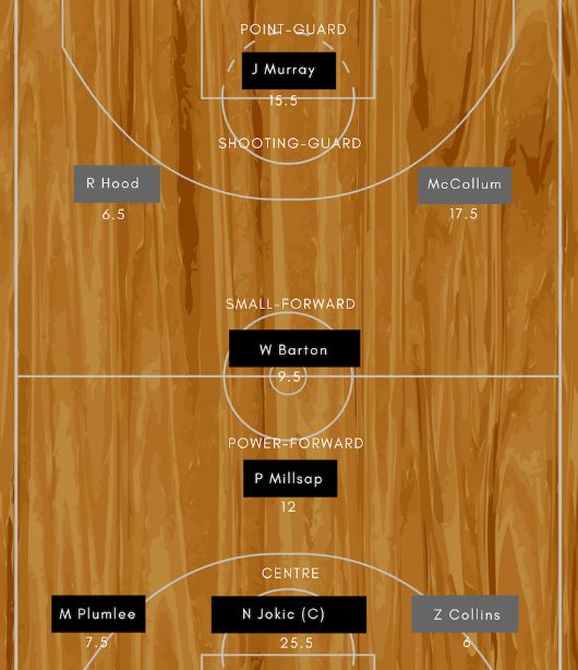 • Denver Nuggets: Torrey Craig (F), Paul Millsap (F), Nikola Jokic (C), Gary Harris (G), Jamal Murray (G)