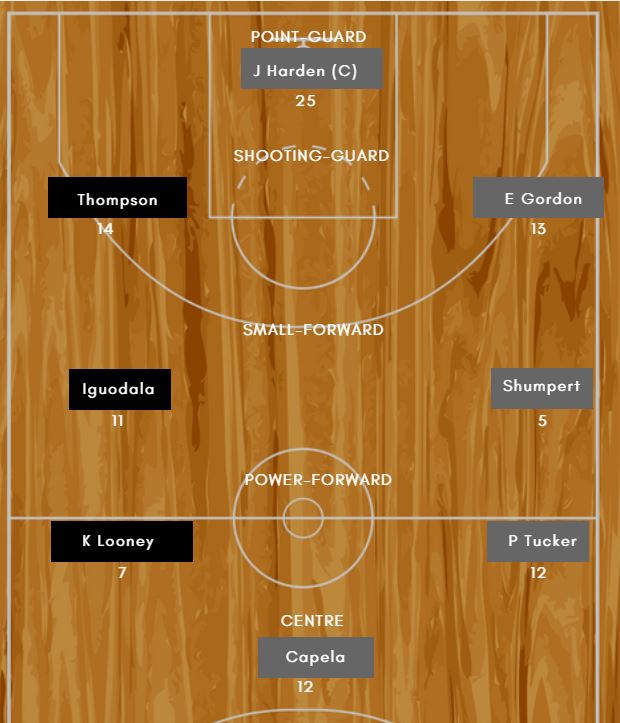 Combination: PG: James Harden (C) SG: Eric Gordon, Austin Rivers, Klay Thompson SF: Iman Shumpert, Andre Iguodala PF: Kevon Looney C: Draymond Green