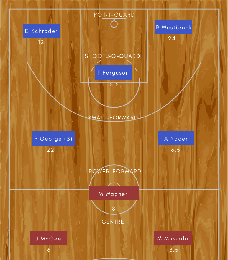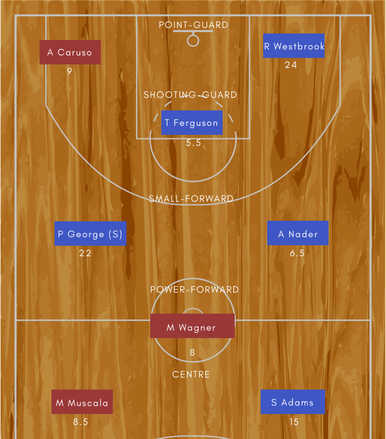 • Oklahoma City Thunder: Paul George (F), Jerami Grant (F), Steven Adams (C), Russell Westbrook (G), Terrance Ferguson (G)