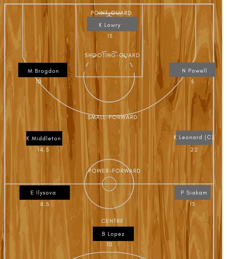 Combination 1: PG: Kyle Lowry SG: Malcolm Brogdon, Norman Powell SF: Khris Middleton, Kawhi Leonard (C) PF: E Ilyasova, Pascal Siakam C: Brook Lopez