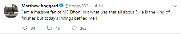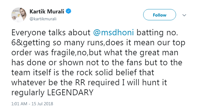 “Everyone talks about @msdhoni batting no. 6&getting so many runs, does it mean our top order was fragile, no, but what the great man has done or shown not to the fans but to the team itself is the rock-solid belief that whatever be the RR required I will hunt it regularly LEGENDARY.”